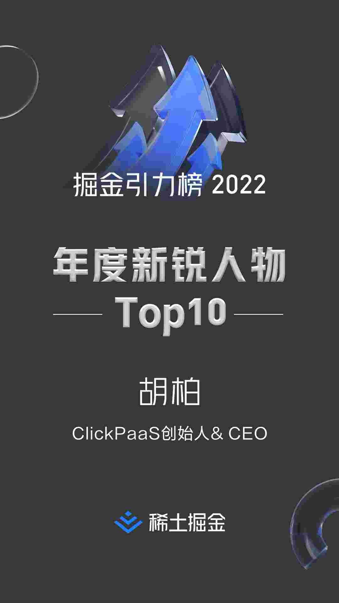2022年1月6日,,,稀土掘金社区第一届「掘金未来大会」成功举办,,会上发布了“2022 稀土掘金引力榜 年度新锐人物”榜单,,,,上海爱湃斯科技有限公司(简称美团钱包商家版)创始人及CEO胡柏实力入选年度新锐人物TOP 10。。